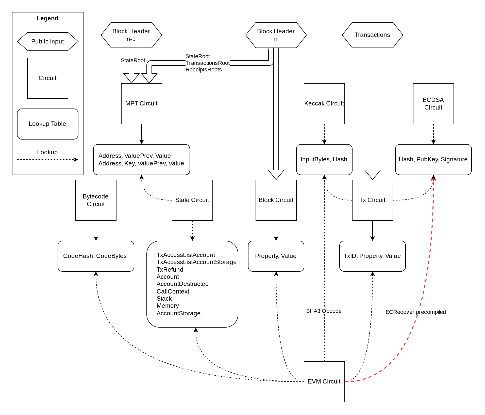 In order to reduce the time required to build a proof of a full block and to simplify the verification step, an aggregation circuit is being build so that condenses the verification of each sub-circuit proofs shown in the diagram. See Design Notes, Recursion for details on the recursion strategy used in the aggregation circuit.